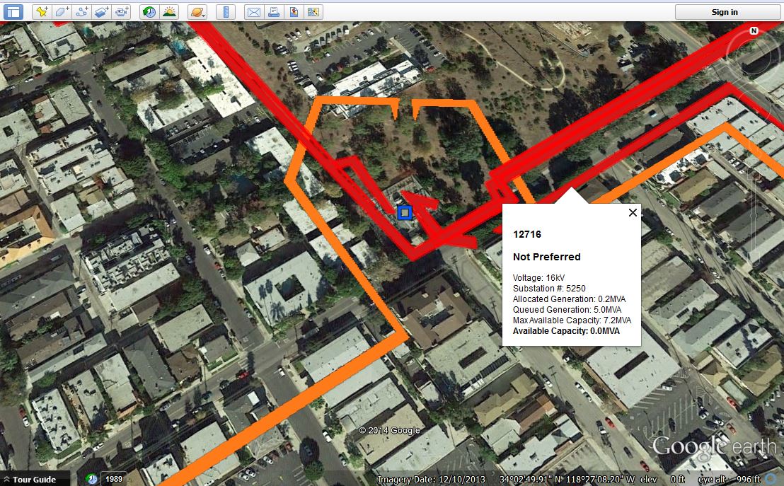 SCE Interconnection MapSouthern California Edison’s Interconnection Map provides SCE system data pertinent to DG developers searching for possible interconnection locations on the SCE distribution system. This set of maps includes the locations of SCE distribution circuits, substations, subtransmission systems, and areas of transmission constraints along with the associated circuit/substation/system voltage, available capacity, and current and queued DG interconnections amounts. The first hyperlink below is for a 12MB kmz file that is opened using Google Earth. It was the current map as of April 15, 2014. A more recent version may be available on the SCE website, see the Source section below. The second hyperlink is a screenshot of one portion of the map (for quick reference). Southern California Edison. "SCE Interconnection Map." Accessed April 2014. Available at https://www.sce.com/wps/portal/home/procurement/renewable-alternative-power-contract-opportunities/auction-mechanism
